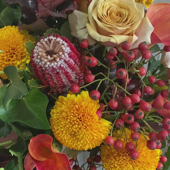When dark nights draw in and the weather turns crisp, THE FREE STATE brings warmth and nostalgia. This luxury asymmetrical bouquet captures the rich, autumnal tones of the changing season with a retro-inspired palette.