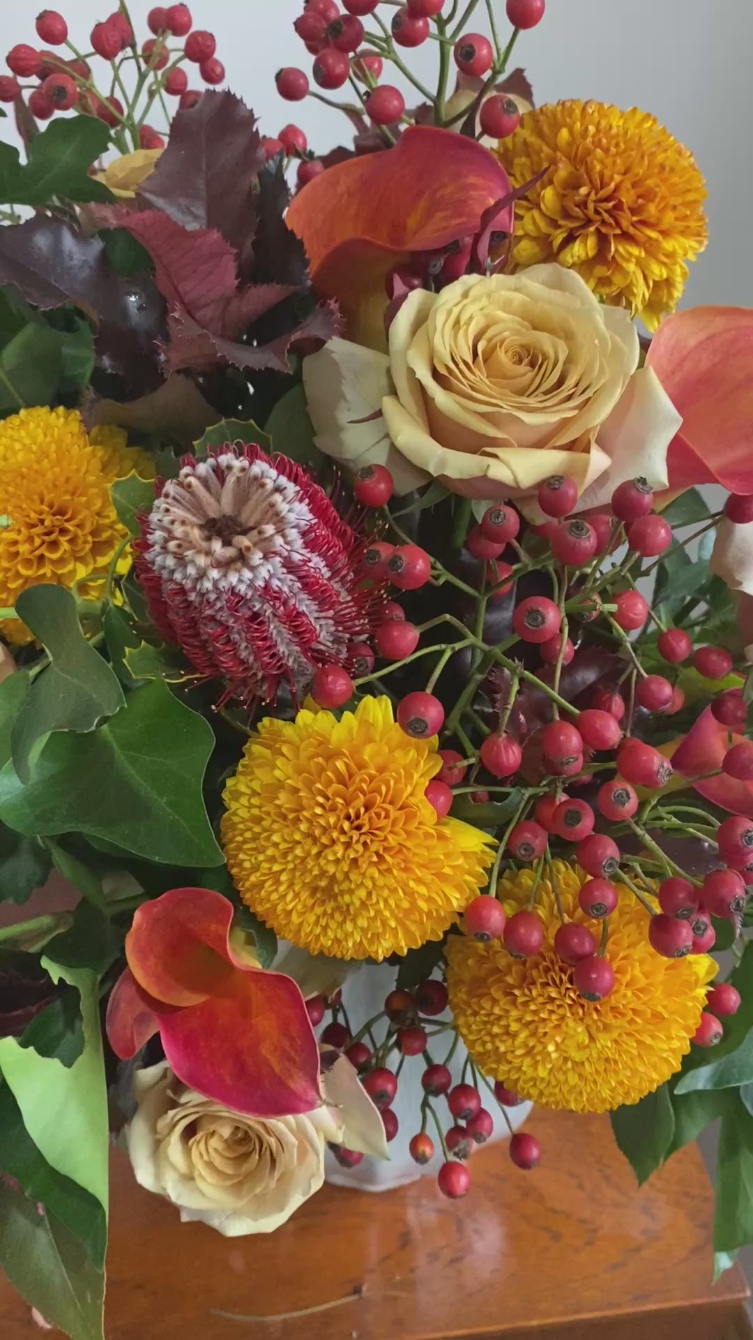 This autumn bouquet features: